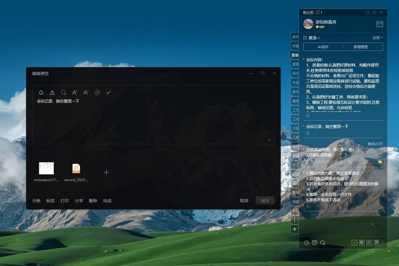 除了外观上的多样性,敬业签的功能也同样强大。它支持多样化的记录方式,包括文字、图片、视频、音频以及Word、TXT等多种格式的内容,都能轻松记录在内。此外,它还具备文字提取功能,能够将图片中的文字信息快速提取至便签,极大地提高了工作效率。用户还可以在便签大窗口中拖拽中线位置,自由调节文字窗口或文件窗口的大小,以适应个人需求。