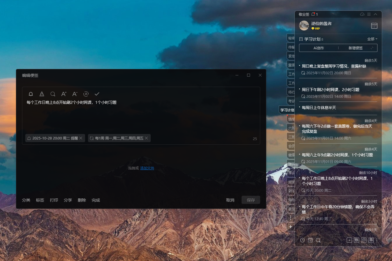敬业签支持设置设置待办事项到期定时提醒,这样就不会忘记了,此外还支持设置重复提醒、重要事项提醒和公历农历提醒等。