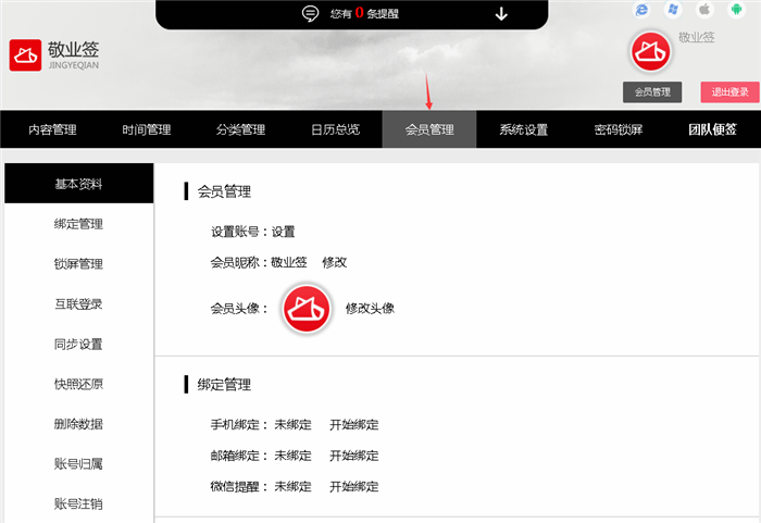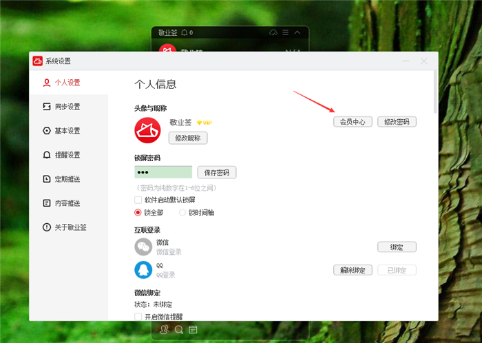 三、在系统设置界面左侧找到“个人设置”,选中“头像与昵称”右侧的“会员中心”按钮,点击该按钮,跳转到敬业签网页版,输入账号密码进入网页版会员管理中心;
