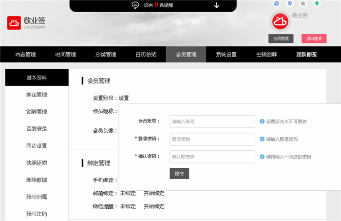四、打开云便签网页版会员管理界面,找到“会员管理”>“设置账号”,点击设置账号后面的“设置”按钮,输入要设置的会员账号、登录密码并确认密码,完成后点提交;