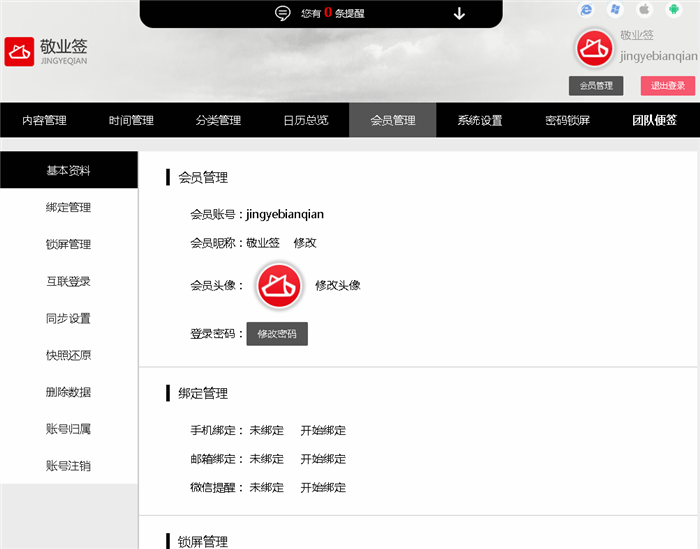 五、提交之后,提示设置修改成功,会员管理界面和网页版右上角会员昵称下方,显示设置过后的账号和密码,代表云便签微信/QQ登录账号设置会员个性账号成功。