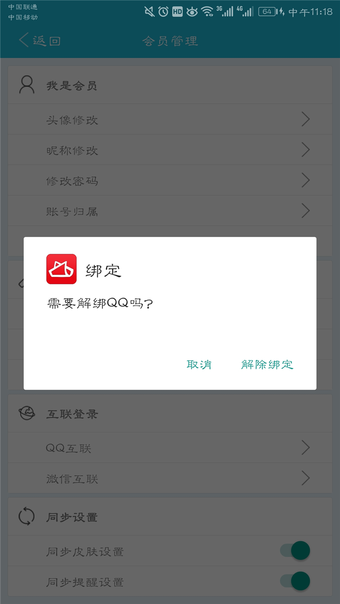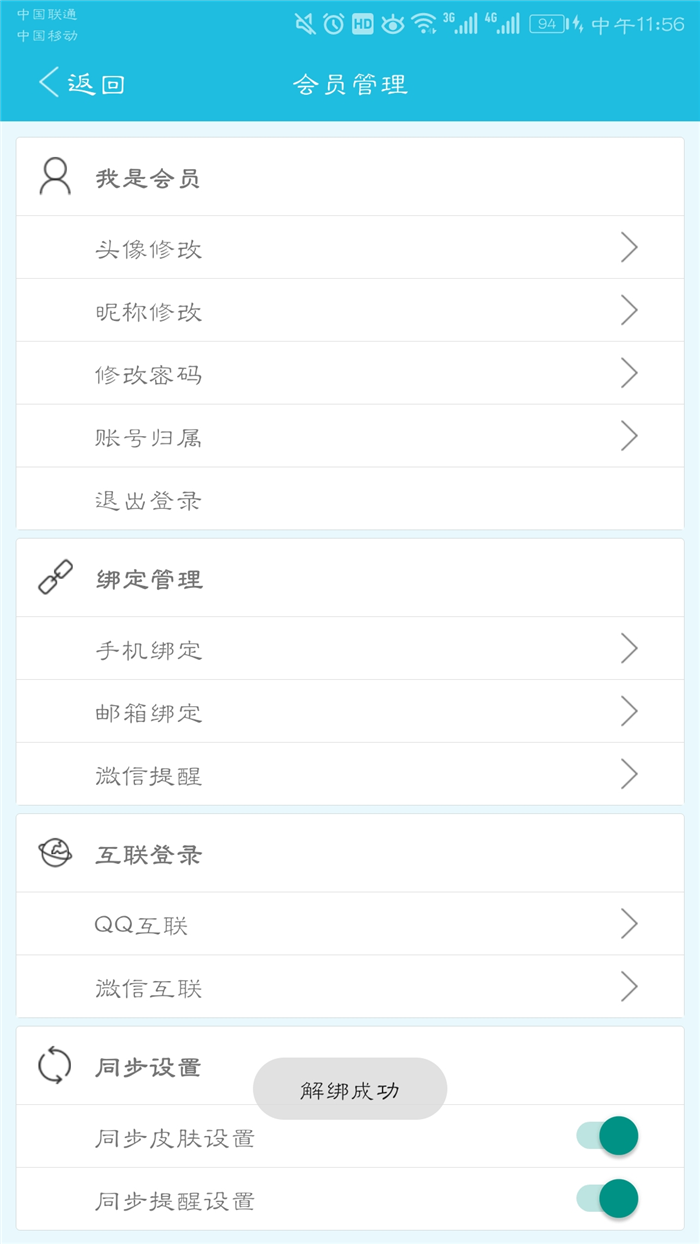 五、成功设置个性账号后,再次选择QQ互联或者微信互联点击“解除绑定”按钮,即可解绑成功。