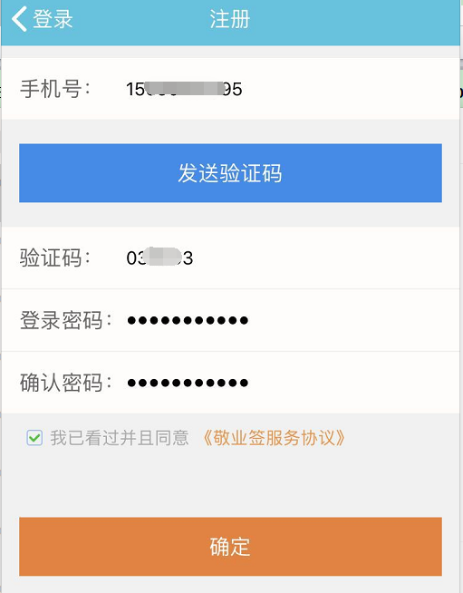 二、输入自己的手机号,获取手机验证码,设置一个易于自己记忆的登录密码,设置完成后,勾选同意敬业签服务协议,点击确定。