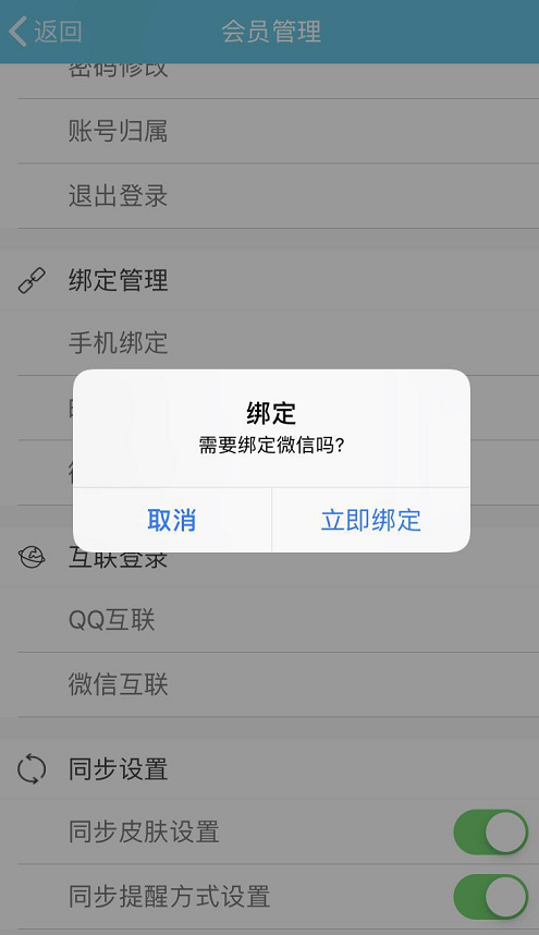 三、选择微信互联后,会弹出一个绑定的提示框,提示:需要绑定微信吗?可选择立即绑定或者取消。