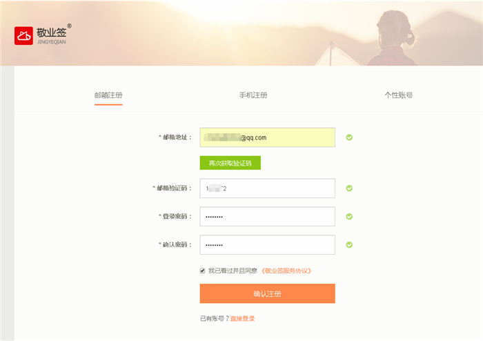 注册敬业签账号所使用的邮箱,需保证其未绑定过其他的敬业签账号,否则在注册的时候将会接收到“当前邮箱已经注册,请你更换邮箱!”的提示。如果用户的邮箱已注册过敬业签账号却不记得密码,可通过敬业签网页版登录界面的“找回密码”,使用邮箱验证重新设置密码,找回之前的敬业签账号。