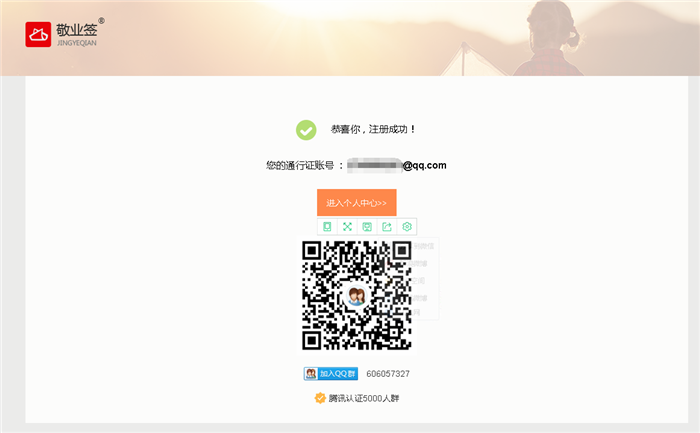 四、确认注册后,弹出“恭喜你,注册成功!”的提示,点击进入个人中心,即可成功进入敬业签Web网页版个人便签主界面。