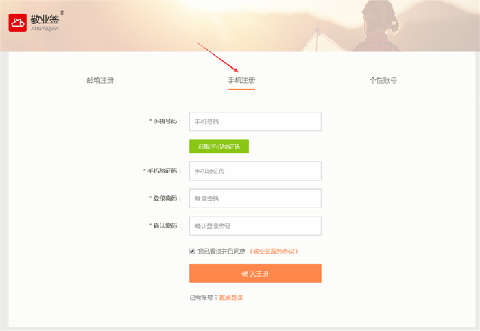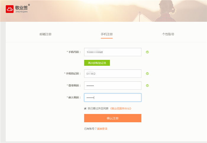 敬业签的注册方式可以分为邮箱注册、手机注册和个性账号三种。准备使用手机注册敬业签账号的用户,可以按照如下步骤完成操作,使用手机号码注册敬业签会员账号,登录敬业签网页版个人便签主页面进行编辑记事。