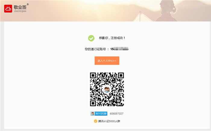 四、确认注册后,弹出“恭喜你,注册成功!”的提示,点击进入个人中心,即可成功进入敬业签Web网页版个人便签主界面。