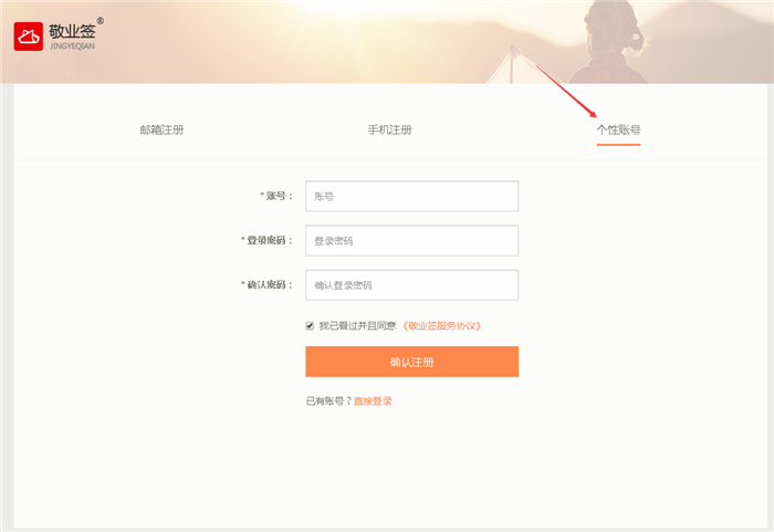 二、点击敬业签Web网页版注册界面右侧的“个性账号”,进入敬业签网页版个性账号注册界面;