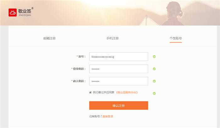 三、设置一个敬业签个性账号(账号不允许输入中文,长度不能低于5位,不能超过30位),输入要设置的登录密码并确认密码(密码长度最少5个字),查看《敬业签服务协议》并勾选我已看过并同意,点击确认注册即可;