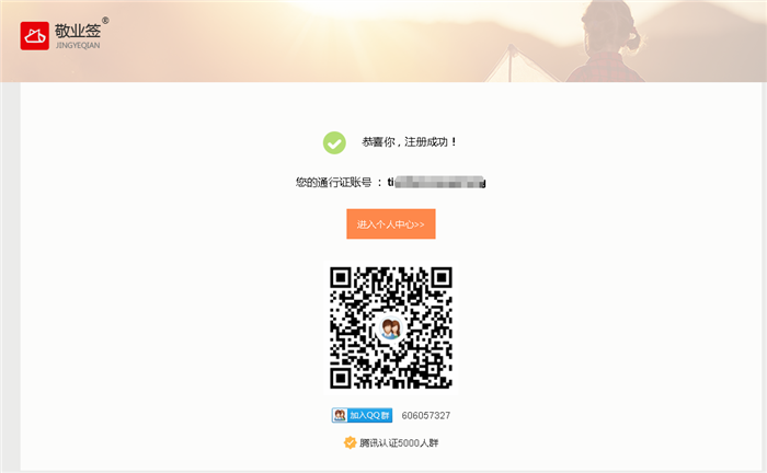 四、确认注册后,弹出“恭喜你,注册成功!”的提示,点击进入个人中心,即可成功进入敬业签Web网页版个人便签主界面。