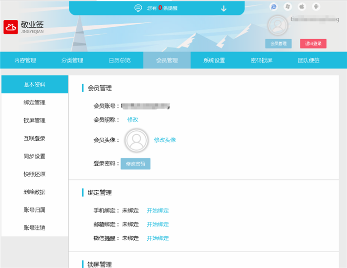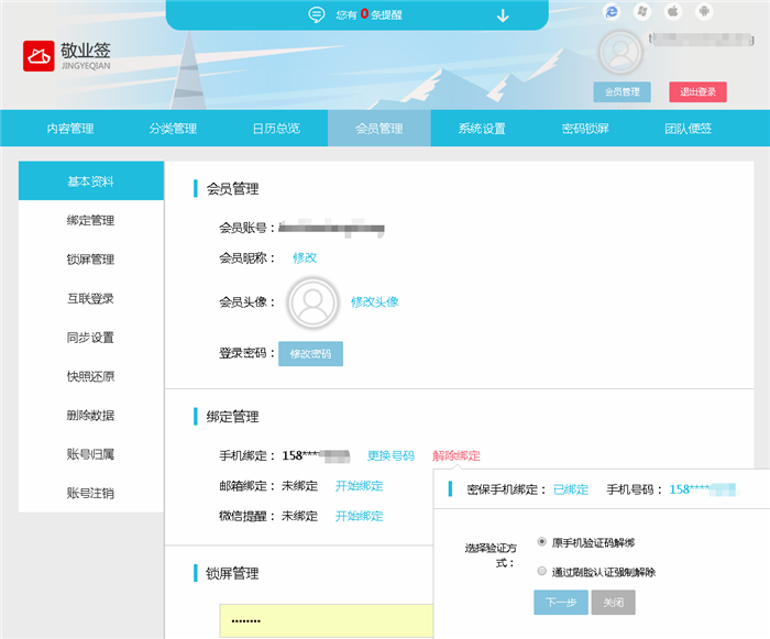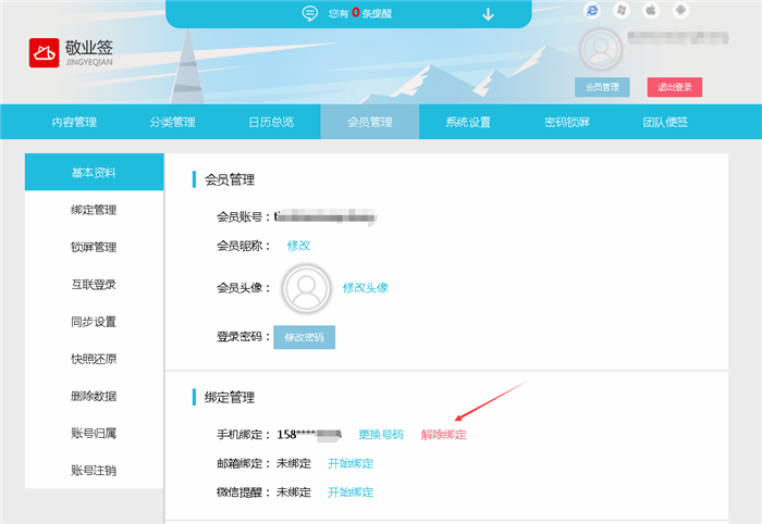 二、在Web网页版个人便签页面,点击“会员管理”功能,找到绑定管理列表里的“手机绑定”,点击其后面的“解除绑定”;