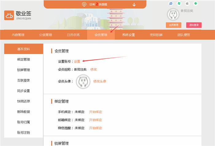 三、点击顶部的会员管理,在会员管理基本资料中找到“设置账号”,点击其后面的设置按钮;