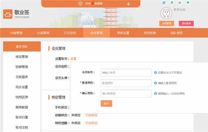 用户在使用敬业签Web网页版登录便签账号的时候,可以选择使用微信或者QQ登录,通过授权直接快捷登录。当用户选择QQ快捷登录的时候,为保护账号安全,用户可以将自己使用QQ登录的敬业签账号注册绑定一个个性账号。在无法使用QQ登录的时候,通过输入所设置的个性账号及密码,也能同步共享和编辑QQ登录账号里的便签数据内容。