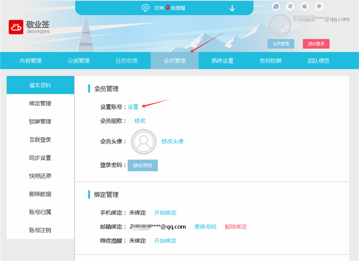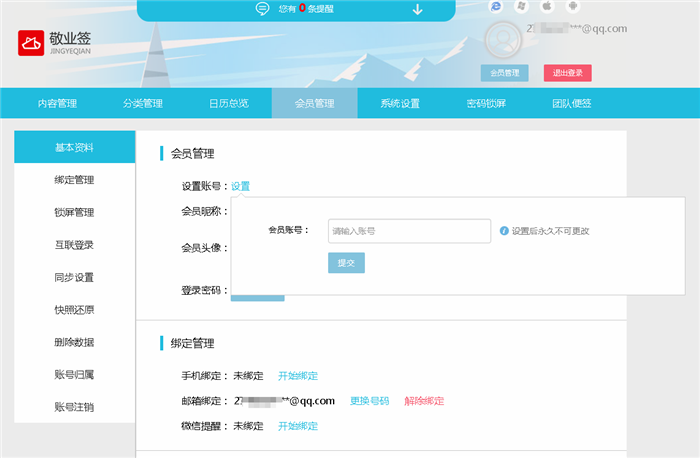 用户设置完成后,在以后登录敬业签Web网页版账号时,不仅可以使用邮箱账号作为登录用户名登录敬业签,还可以通过设置的会员个性账号名称进行登录,同步共享邮箱登录账号里记录的便签内容。