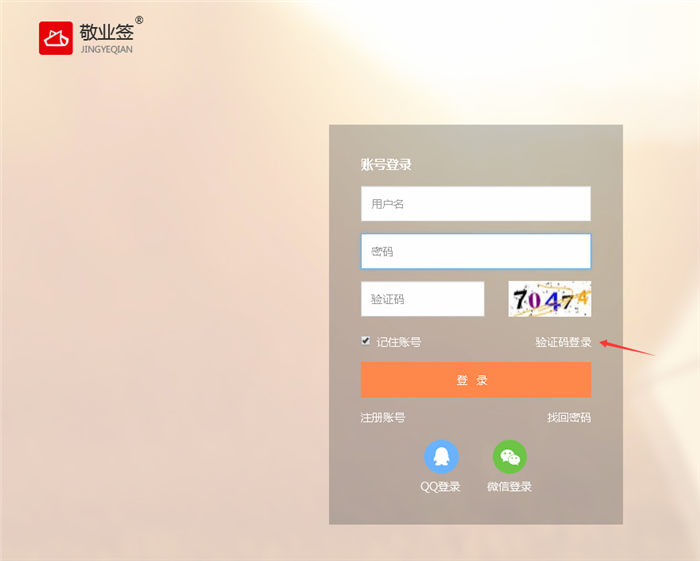 一、打开敬业签官网(https://www.jingyeqian.com/),点击顶部右上角的登录按钮,进入敬业签Web网页版登录界面,找到“验证码登录”按钮选项,点击进入;