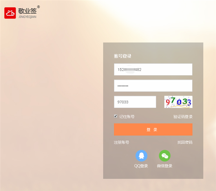 二、输入注册敬业签账号时所使用的手机号码或者已绑定敬业签账号的手机号码,同时输入密码以及图片验证码上的数字;