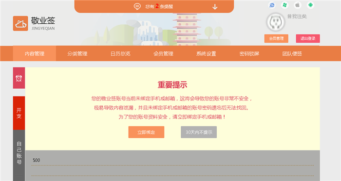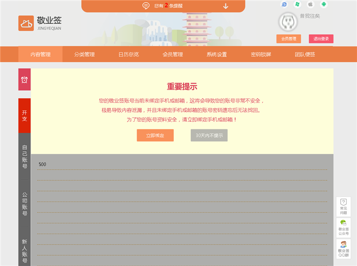 3.2、无论是拥有敬业签老账号的用户还是新用户,如果微信/QQ互联登录的账号未绑定手机或邮箱,在登录敬业签网页版之后会接收到“当前敬业签账号未绑定手机或者邮箱”的重要提示,需手动选择“立即绑定”或者“30天内不提示”。