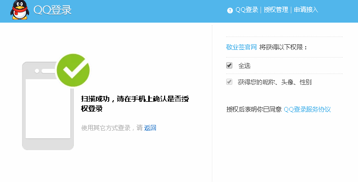 1.2、使用QQ登录的用户,可直接点击已有的QQ头像,或者使用QQ手机版“扫一扫”功能扫描二维码,确认授权允许登录敬业签官网;