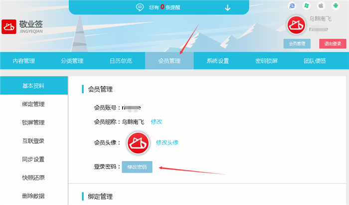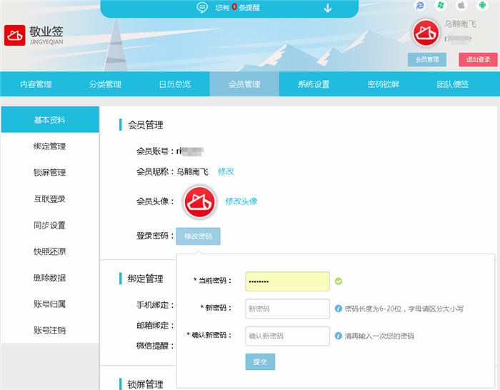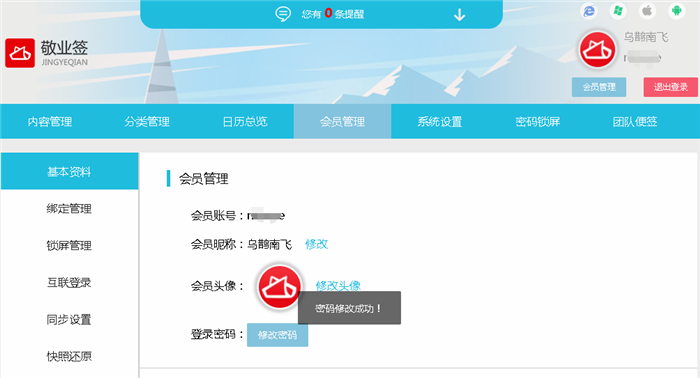 敬业签Web网页版便签怎么修改登录密码?