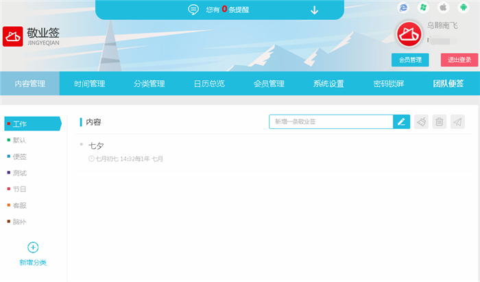 四、成功登录敬业签账号,默认进入内容管理界面,点击“会员管理”功能栏,找到绑定管理,即可看到自己已有的敬业签账号已成功与QQ或者微信完成互联登录绑定。