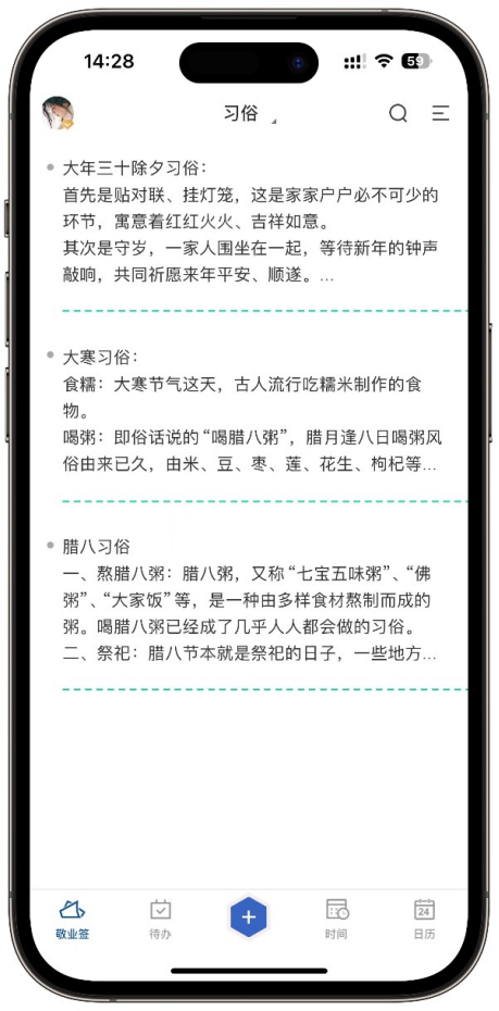 然而,在快节奏的现代生活中,我们可能会因为忙碌而忽略了这些传统习俗。为了让年味更浓,我推荐大家使用敬业签备忘录。它不仅可以记录文字,还能上传相关视频和图片,让我们在忙碌的生活中也能轻松回顾和传承这些传统习俗。