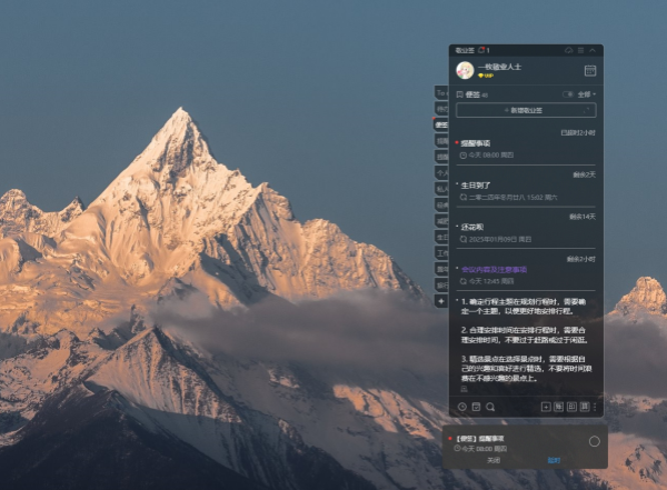 为了提升工作效率,合理安排时间必不可少。敬业签支持多种提醒方式,包括一次性定时提醒、周期性重复提醒(按天/周/月/年)、以及间隔提醒等,用户可根据任务优先级灵活设置。当设定时间到达时,系统会自动弹窗提醒,帮助用户准时完成每项任务,从而有效避免因遗忘而导致的工作延误。
